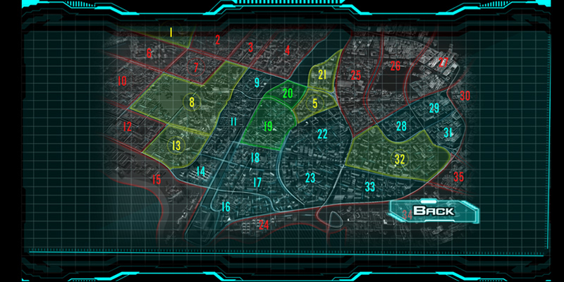 进入地图界面后,玩家可以从当前区域移动到相邻区域。右边的一排按钮为相邻区域选项,区域的敌情也会按照颜色显示。左侧按钮还可以重新进入原来的区域。 按City可以进入地图一览。