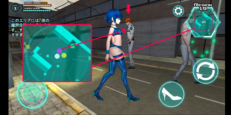 玩家需要消灭此区域所有潜藏魔界生物,可以从小地图上面发现它们的行踪,黄色的圆形是普通市民,紫色的圆形是敌人,玩家是白色圆形。