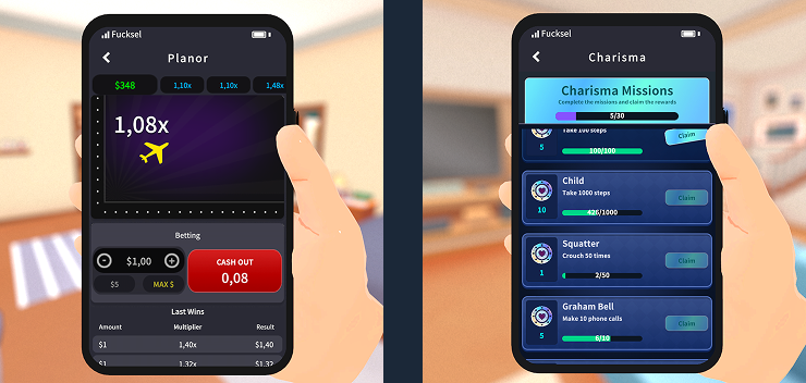 游戏介绍邂逅迷人女士 滑动视频并致电她 使用您的全交互手机致电女孩们,告诉她们您想做什么,并邀请她们过来。通过赠送礼物来增进感情,但请记住,每个女孩都有不同的喜好。有些人喜欢珠宝,而有些人则不愿意用长棍换取任何东西。与她共度美好时光 拍照并与其他玩家分享 致富并建设您的角色 用金钱填满您的钱包,增加被动收入。通过小游戏丰富自己,升级您的角色。这样,您就可以同时与多个女孩交往!您的手机应用程序和游戏玩法 特色功能 自由移动和手机: 在家中随心所欲地漫游。在任何您喜欢的地方打开和使用手机。通过各种不同的应用程序决定如何游戏。 独特角色: 有6个不同的女性,您可以与她们建立并加强关系。这些女性喜欢不同的东西。不如找到让她们快乐的正确方式? 角色扮演!: 发展您的角色完全取决于您。完成任务以收集奖励并丰富游戏循环。在线社交媒体: 与人们分享您拍摄的照片!查看他们分享的内容!